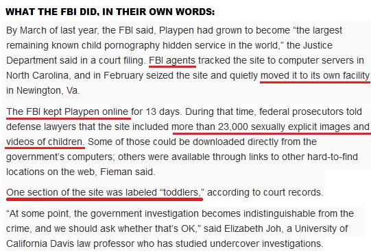 Tra il 20 febbraio e il 4 marzo, l’FBI ha gestito uno dei maggiori siti di pedopornografia: playpen. Come sia stato effettuata quest’operazione e l’operazione stessa rimane un’informazione per lo piú riservata, ma il Dipartimento di Giustizia ha riconosciuto nella documentazione processuale che era l’FBI ad esserci dietro.